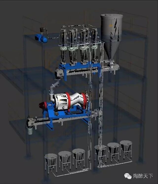 原材料→球磨→进浆池→中转缸→喷雾制粉→料仓→干法混色系统——压机顶料仓→成型