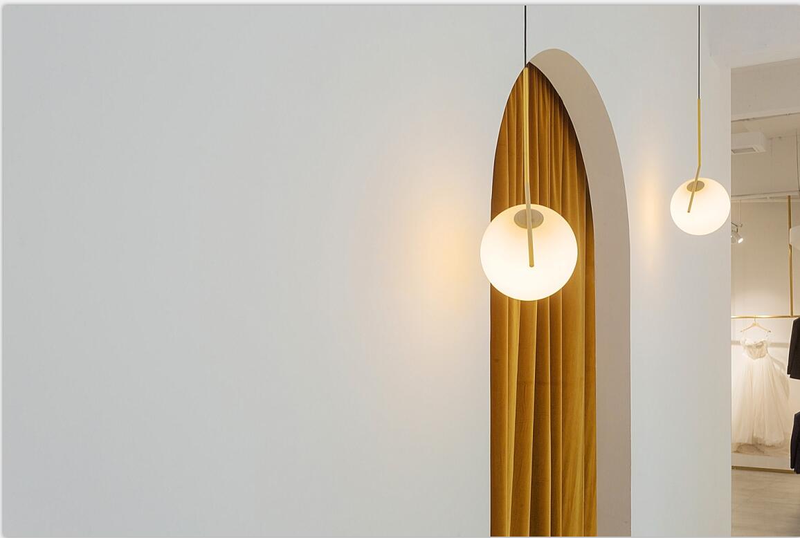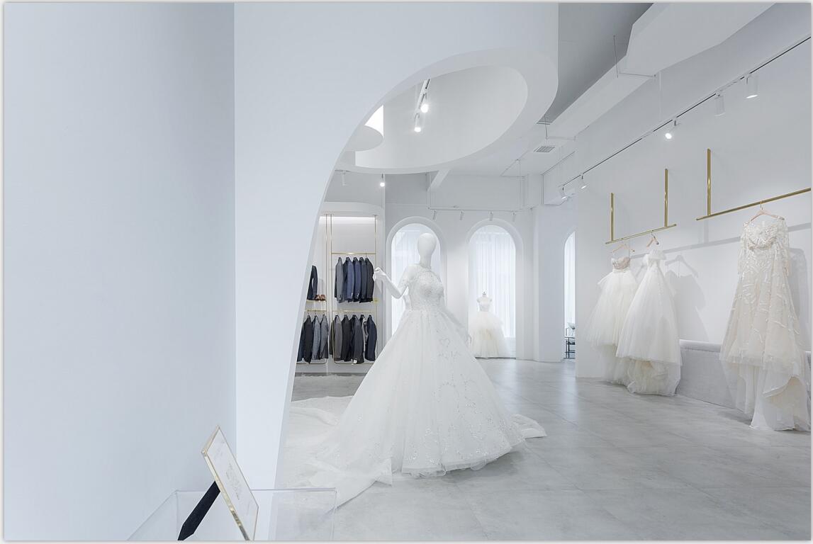 简单纯粹的纯白传达出永恒和纯洁的信念,也是表达空间形态的方式。空间中轴展示的弧形流线,是为了给顾客创造多种美好的想象,可以是婚纱随风飘逸时呈现的流动曲线,也可以理解为跳动的音符,带动了整个室内的浪漫节奏。