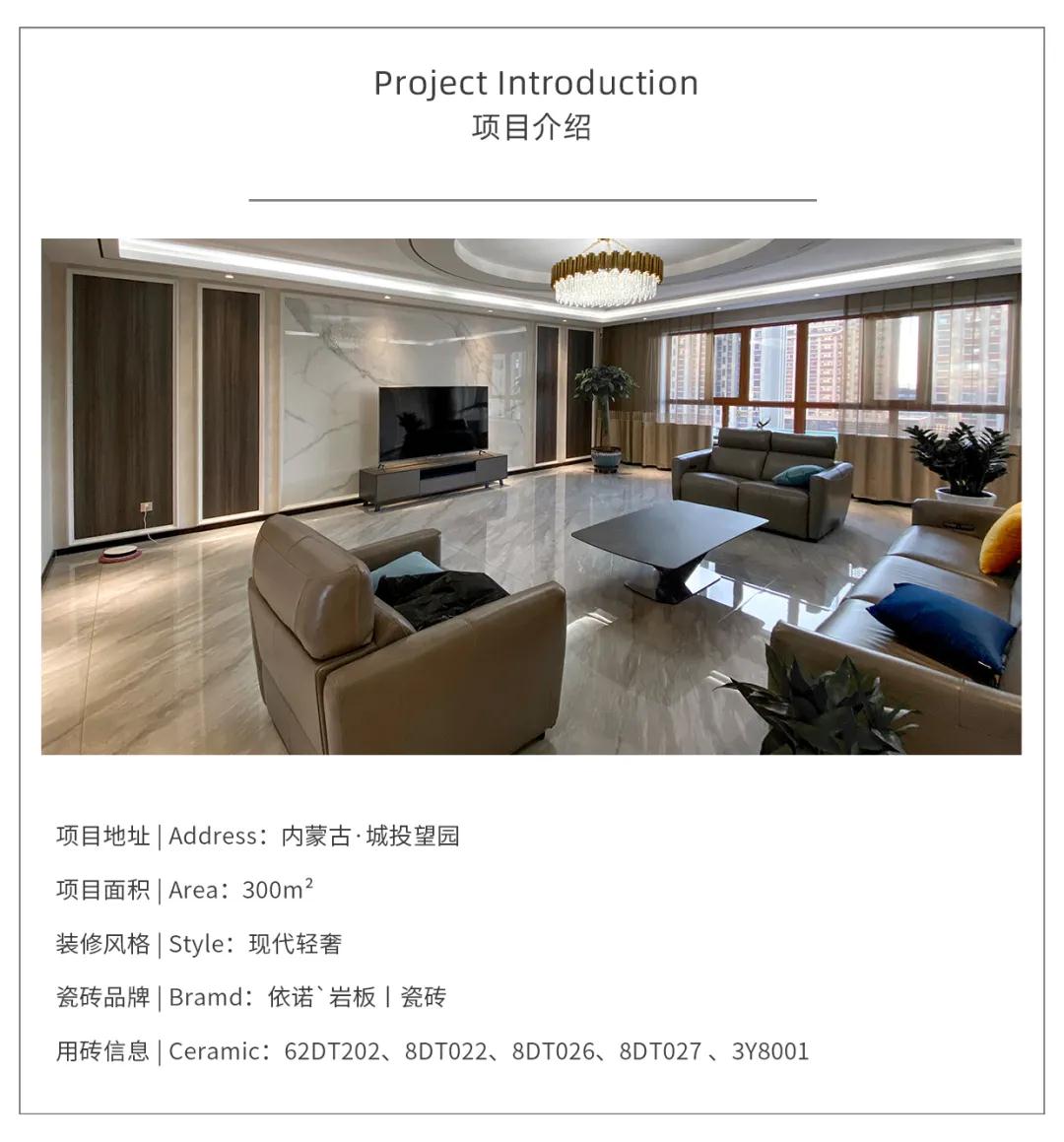 本期依诺瓷砖【老友记】案例是位于内蒙古海拉尔【城投望园】的一个复式项目,空间选用依诺连纹大板瓷砖和大理石瓷砖。