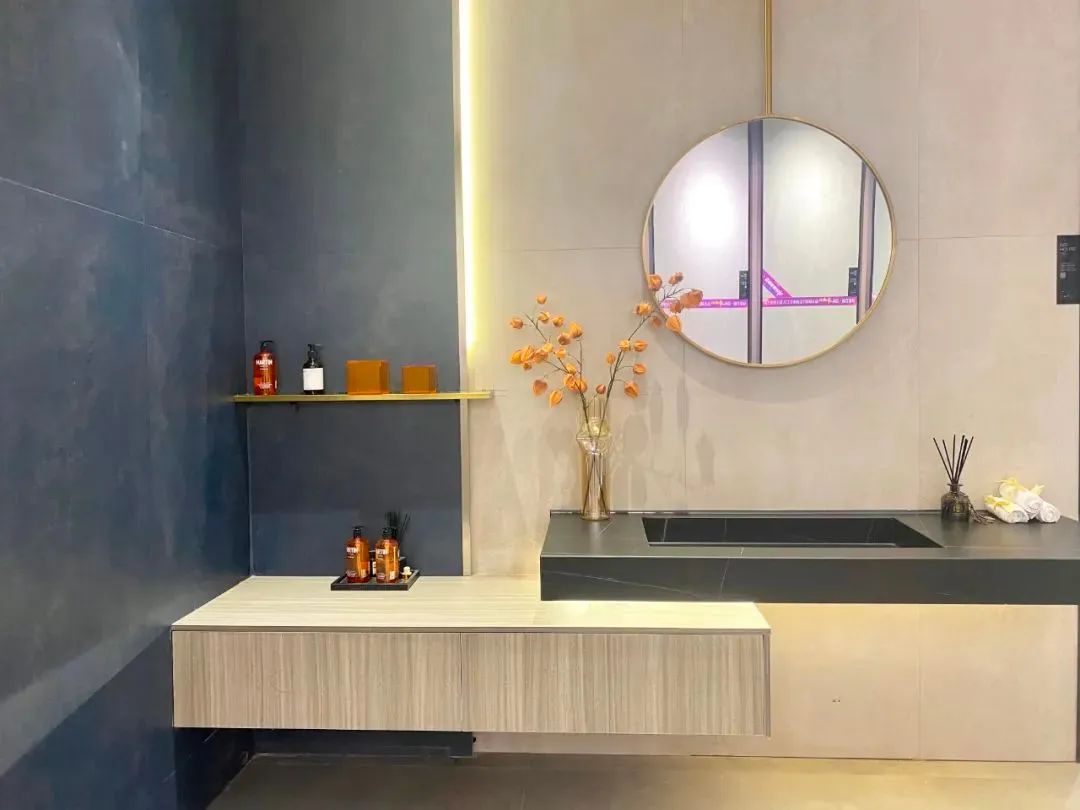 相较于「颜色」,「质感」才是侘寂风的关键,它主张自然呈现岁月刻蚀下特有的斑驳美感。于是,地面选用微水泥质感的【卢斯】微水泥瓷砖通铺,是最合适不过了的。